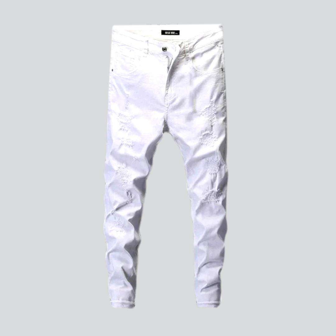 Introducing the 2023 Summer Collection �the perfect blend of '90s grunge and contemporary chic! Our white distressed jeans for men are the ideal expression of rebellious sophistication. boasting an edgy damaged pattern and sleek thin fit type for effortless elegance. With a mid-waistline fit. zipper & button closure. and made with premium quality denim. these jeans are set to be the crowning jewel of your summer wardrobe.