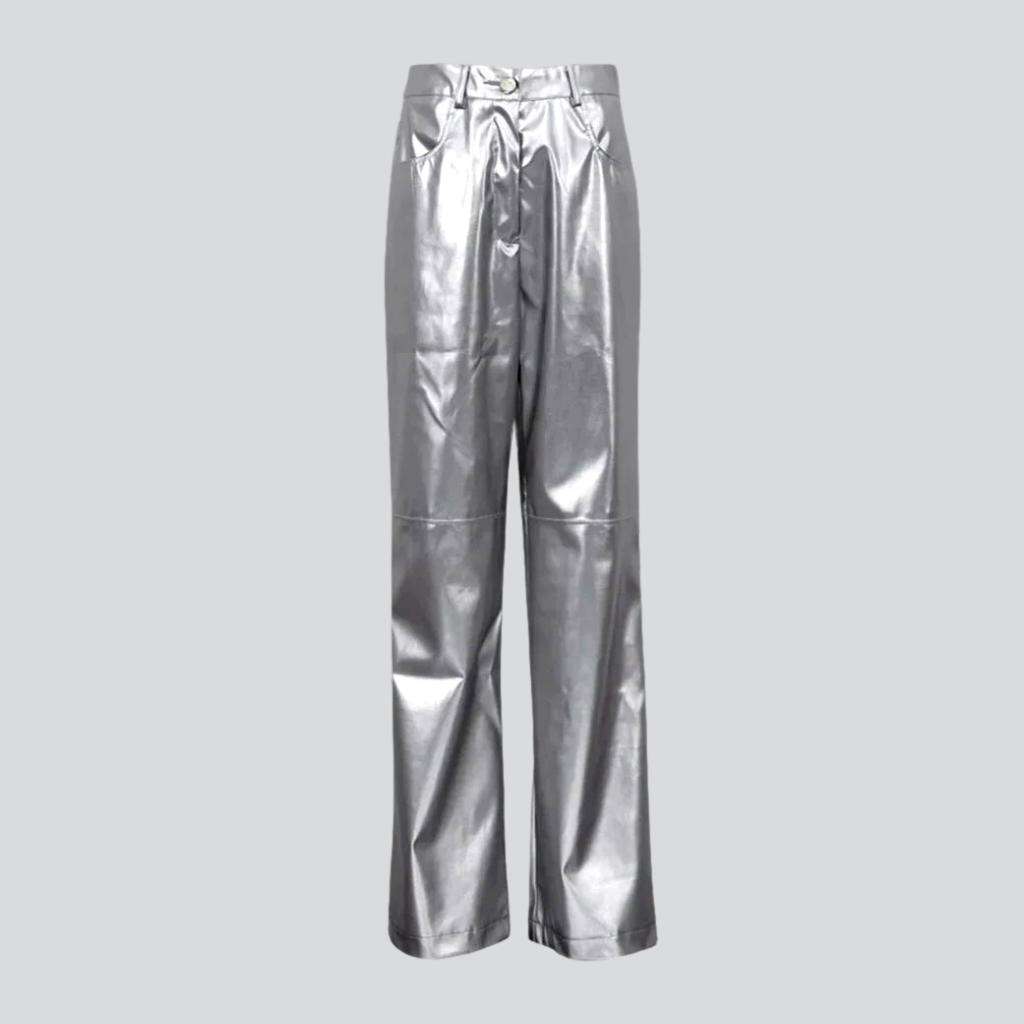 With an eye-catching silver pattern. these jeans are designed for the vogue-forward individuals who demand only the best. The wide-leg fit. high waist. and zipper & button closure are sure to make a statement at any occasion. whether it be a non-formal outing or a high-end gala.